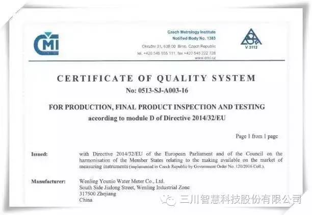 发布时间:2016-07-13近日,捷克国家计量院(CMI)为B体育亚洲官方网站智慧控股子BSPORT温岭甬岭水表有限BSPORT(简称:甬岭水表)签署颁发了“B+D”MID认证模式中,“B”模式和“D”模式证书。获得此类证书,BSPORT产品将具备加贴CE标志资格,如同获得了欧盟市场自由通行证。