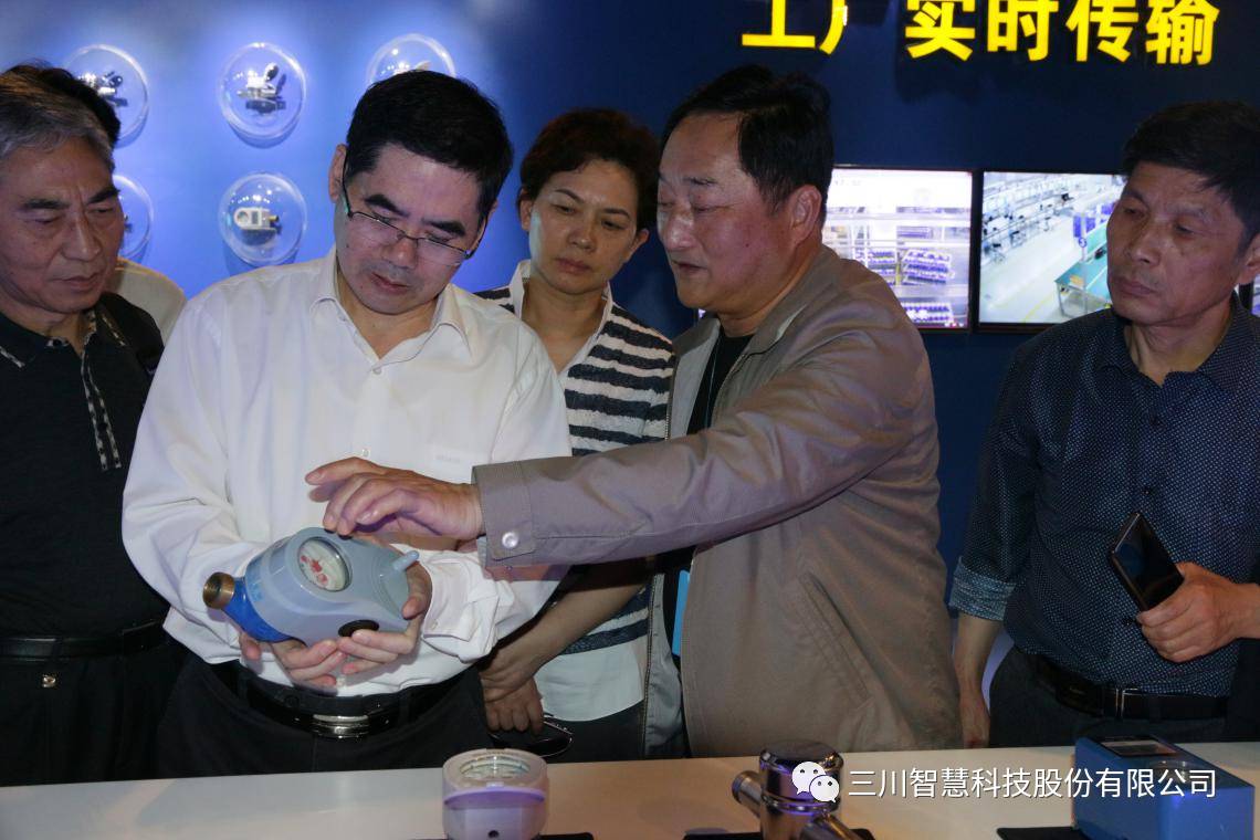 李董事长(右二)向汤主席(左二)一行介绍物联网水表
